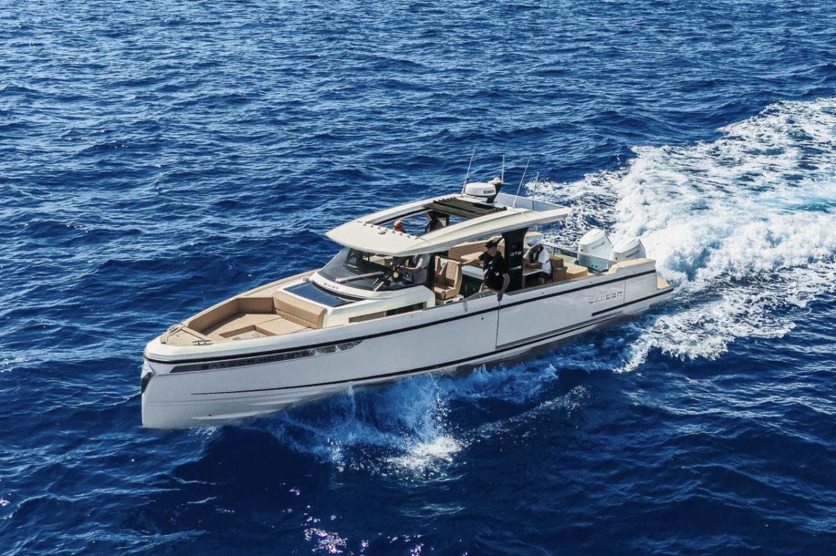 Ce dayboat de 12,4 m de long et 3,55 m de large dispose d'un tirant d'eau de 0,75 m, facilitant l'accès aux criques et mouillages. Les terrasses latérales s'ouvrent pour élargir l'espace, tandis que les sièges convertibles avant et arrière passent de dinette à bain de soleil en un instant. Le poste de pilotage protégé offre une visibilité panoramique et des commandes intuitives.Spécifications Techniques